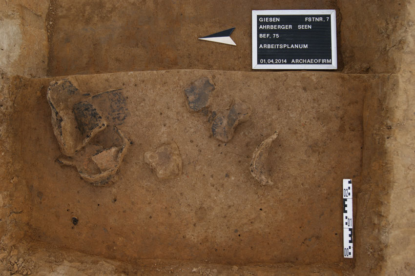 Östlich von diesen Befunden waren innerhalb der Grenzen des Baugebietes hingegen vorwiegend bronzezeitliche Siedlungsgruben anzutreffen, die keine erkennbare Verdichtung aufwiesen. Der vorgeschichtliche Begehungshorizont dieser Zeit muss innerhalb des bestehenden Oberbodens gesucht werden, da bereits hier zahlreiches Fundmaterial aufgefunden wurde. Es handelte sich dabei nicht um zerscherbtes und durch landwirtschaftliche Bearbeitung verlagertes Keramikmaterial, sondern um zwar zerbrochene aber vollständige Gefäße in situ, die innerhalb der obersten 50 cm des Oberbodens lagen.