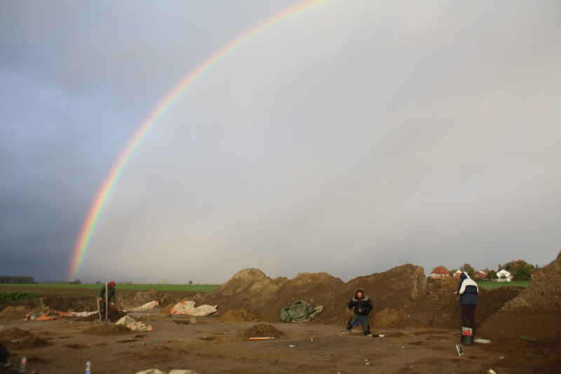 Die Erweiterung eines Neubaugebietes am Nordrand von Hiddestorf machte bauvorbereitende Untersuchungen auf der bekannten Fundstelle (s. Fundchronik 2008/09, 51 Kat.Nr. 71) notwendig. Die 2008 bei der Erschließung des ersten Bauabschnittes aufgedeckten Siedlungsspuren der vorrömisches Eisenzeit und Römischen Kaiserzeit setzten sich nach Osten fort. Im Vorfeld durchgeführte Sondagen zeigten, dass auf der rund 3 ha großen Erweiterungsfläche mit Siedlungsbefunden in wechselnder Dichte gerechnet werden musste. Um „archäologiefreie“ Baugrundstücke vermarkten zu können, finanzierte der Erschließungsträger, die Kreissiedlungsgesellschaft Hannover, eine mehrmonatige Ausgrabung, in deren Verlauf die gesamte Fläche des zweiten und dritten Bauabschnittes mit Ausnahmen des zukünftigen Spielplatzes bauvorbereitend untersucht wurde. Lediglich der Ausbau der Straße „Wiesenweg“ musste baubegleitend dokumentiert werden. Da hier, wie auch im Bereich des um das Wohngebiet herumführenden Fußwegs, die Befundsubstanz erhalten bleibt, wurden die in dieser Fläche aufgedeckten Befunde nur im Planum erfasst und ggf. ihre Tiefe mithilfe eines Bohrstockes ermittelt.